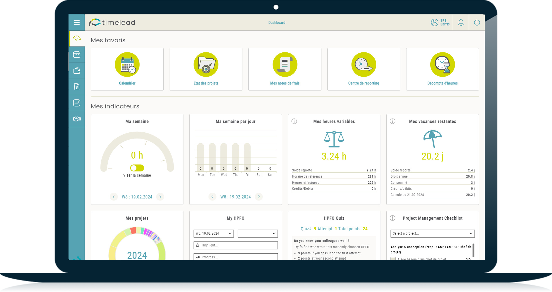 Au niveau des menus, l’équipe a repensé entièrement l’organisation des pages. Avec un système de cartes, expliquant en quelques mots à l’utilisateur l’essentiel des fonctionnalités de chaque page. La saisie des heures est facilitée, sur toutes les plateformes, l’interface ayant été rendue davantage « responsive ». L’ajout d’un tableau de bord, avec les favoris et des indicateurs pertinents, est une des nombreuses améliorations voulues pour améliorer l’expérience utilisateur.