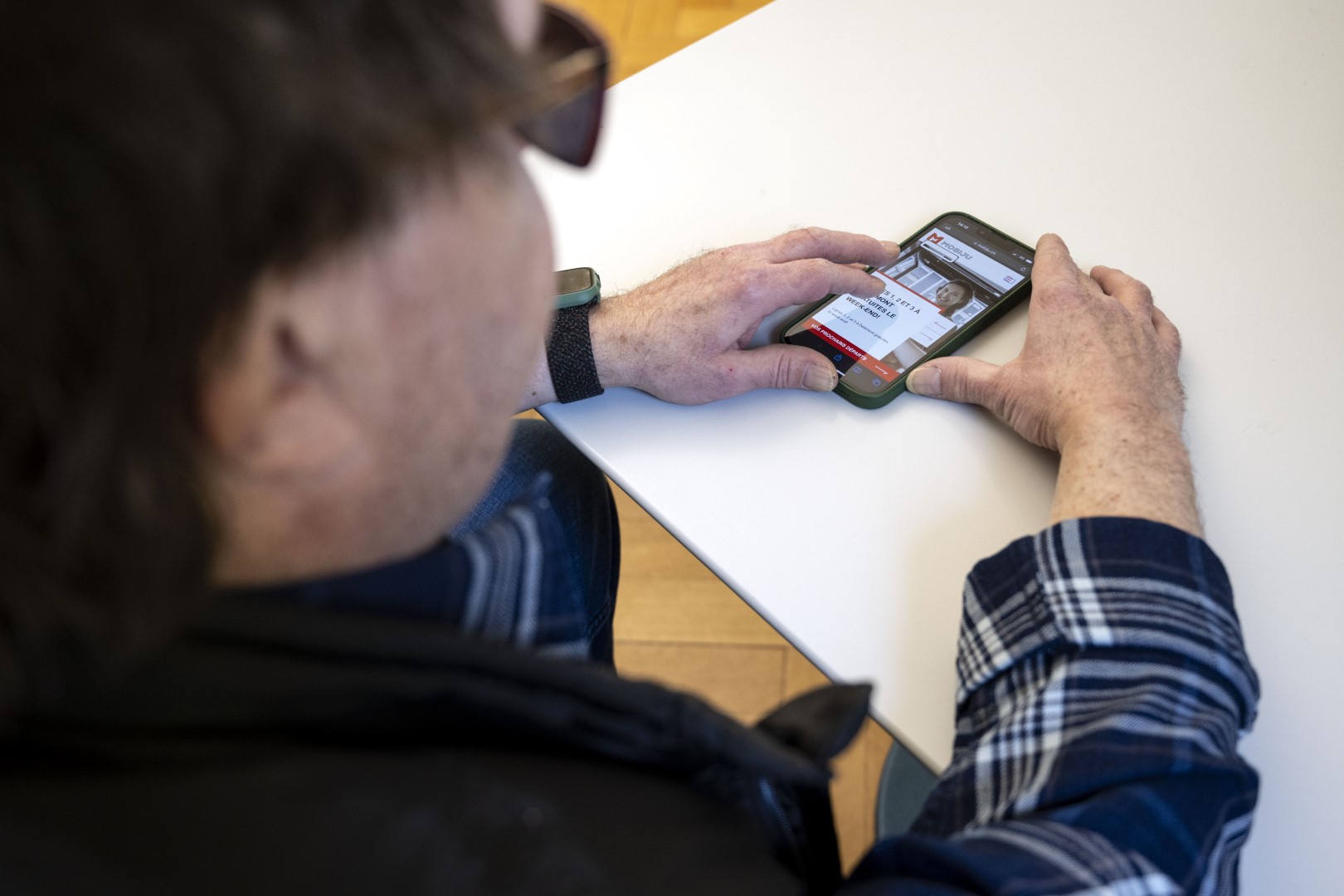 Son index file sur l’écran noir du smartphone. Jérôme Corbat est non-voyant. Il voit toutefois très bien avec ses doigts, et est intraitable lorsqu’il évalue l’accessibilité du monde digital aux aveugles. A la demande de MOBIJU, le réseau des bus jurassiens pour qui nous avons développé un nouveau site web, une séance de travail a été agendée avec Jérôme Corbat. « Il nous avait fait des remarques sur l’accessibilité de la précédente version du site. J’ai entamé le dialogue avec lui et eu envie d’intégrer Monsieur Corbat au développement de la nouvelle version », explique Willy Fantin, spécialiste marketing et service client chez Car Postal, qui gère le réseau MOBIJU.